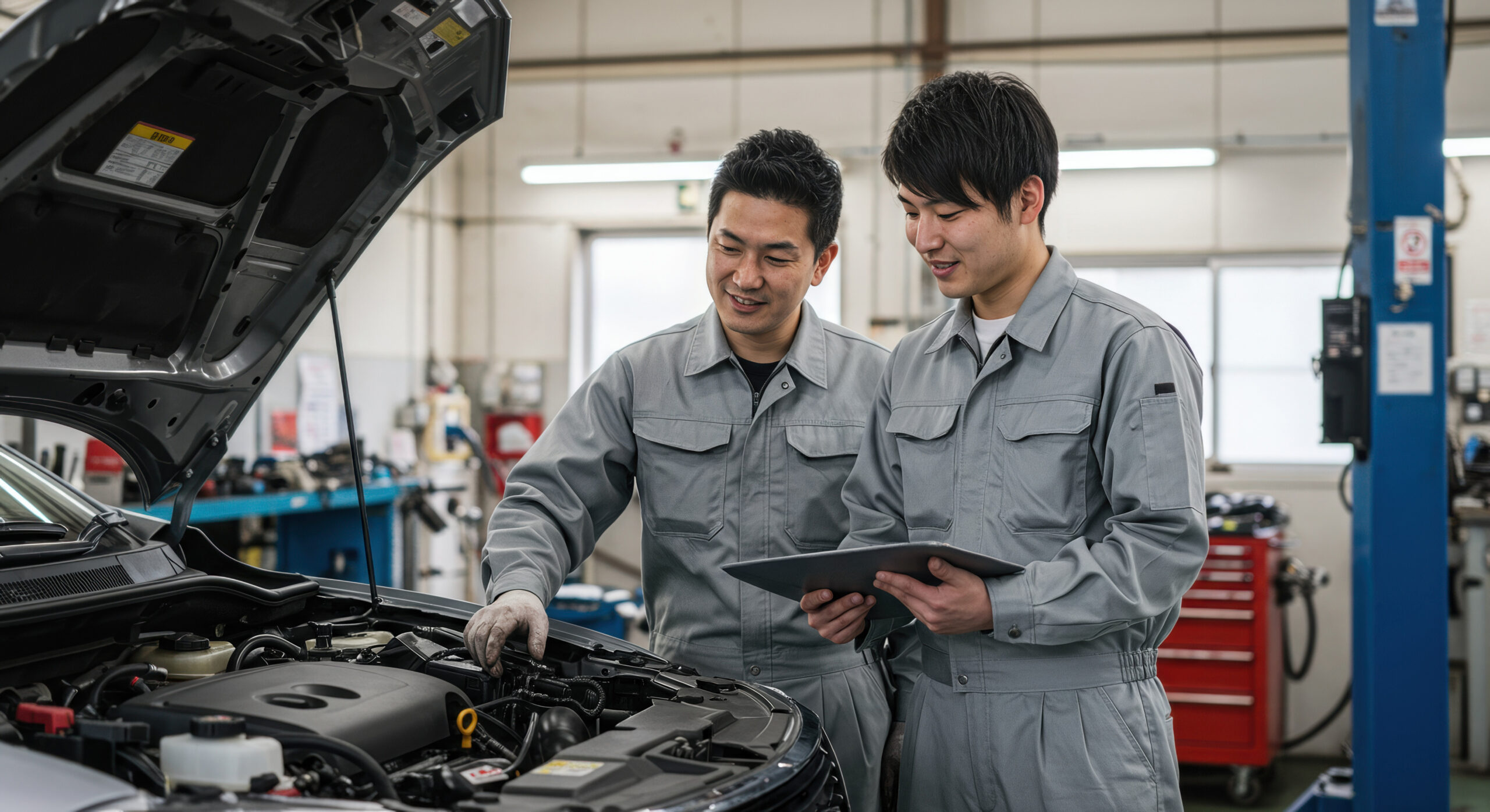 故障診断機の操作やエンジン整備など、幅広い技術が身につきます。